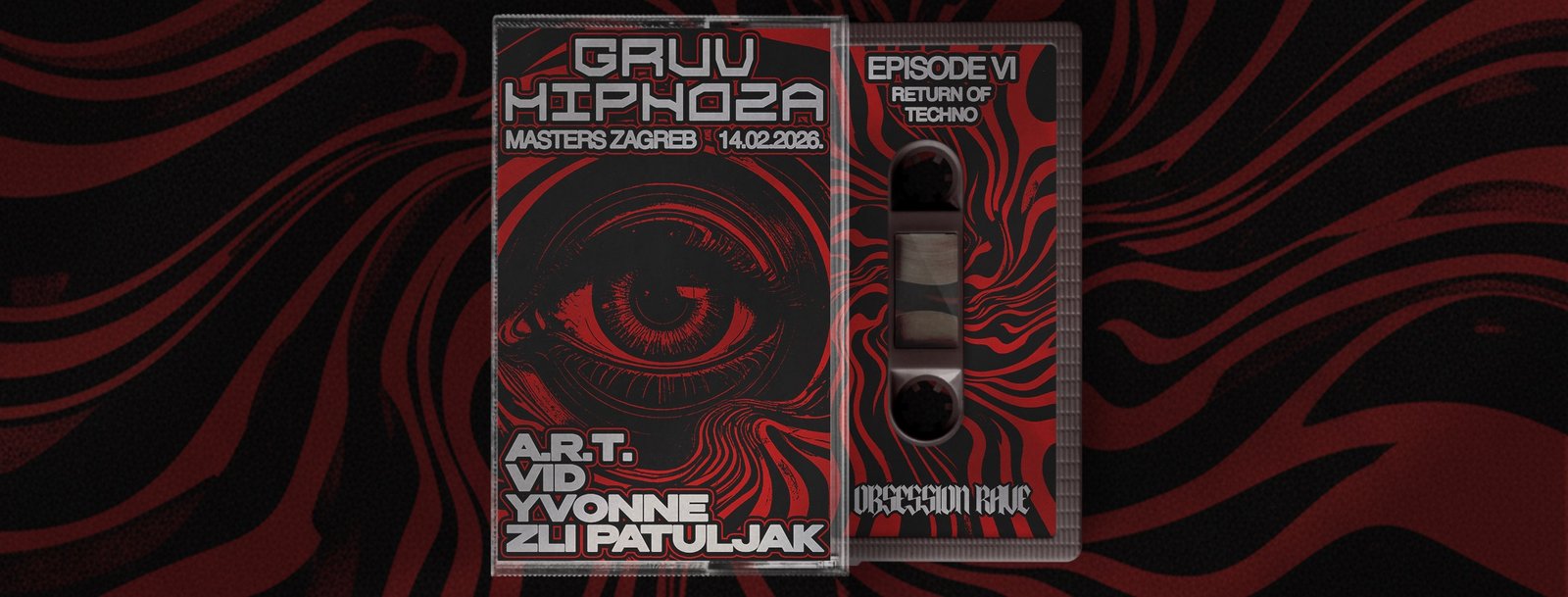 After a three-month break, Gruv Hipnoza returns with a new edition titled “Return of Techno”, taking place at Club Masters in Zagreb. The event marks one year since the first Gruv Hipnoza night and coincides with a Valentine’s Day edition, combining a celebratory atmosphere with a focus on hypnotic, groove-driven techno.
