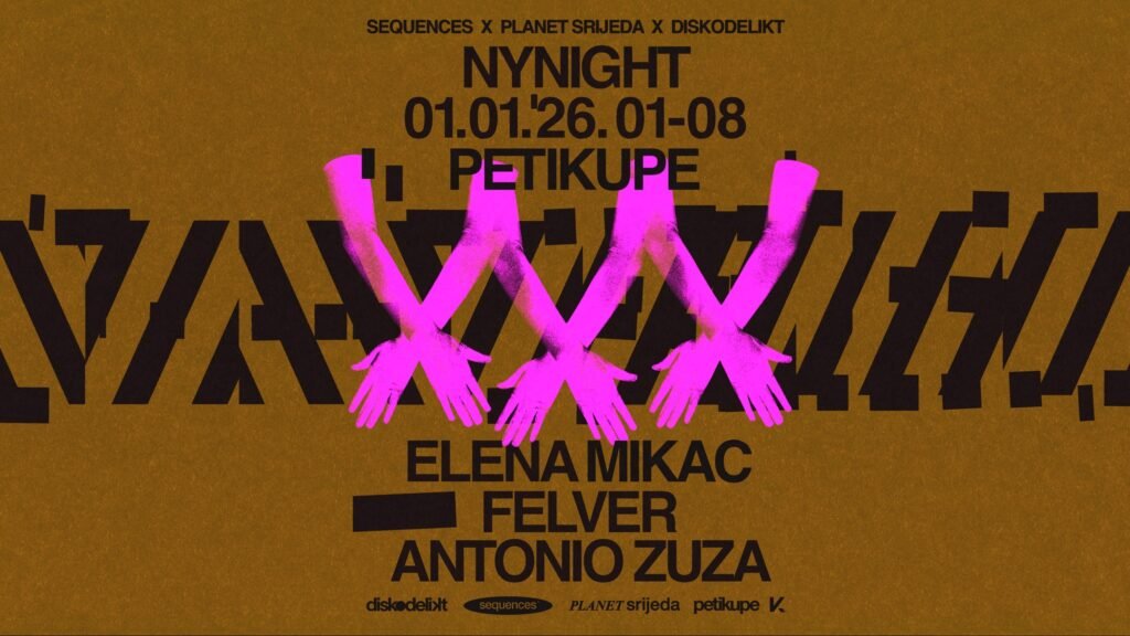 On the night marking the start of 2026, Peti Kupe will host a joint New Year’s gathering organized by three established Zagreb club programs: Diskodelikt, Planet Srijeda, and Sequences. Their founders and resident DJs, Elena Mikac, Felver, and Antonio Zuza, will share the lineup, presenting a coordinated program focused on contemporary club music and groove-oriented selections.