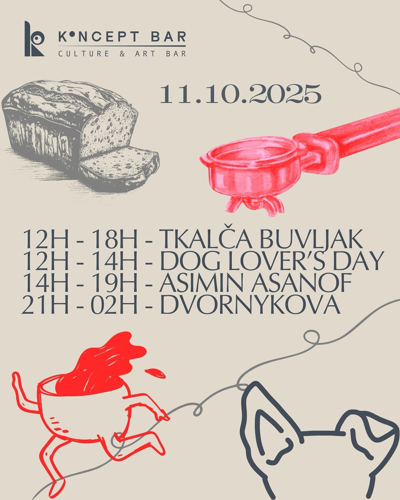 Koncept Bar is keeping things easy and social this Saturday on Tkalča. It kicks off with Dog Lover’s Day from 12–2 PM, so you can grab a drink and hang out with your pets while the flea market runs nearby until 6 PM. Asimin Asanof takes care of the daytime soundtrack (2–7 PM), and Dvornykova closes things out with an evening set (9 PM – 2 AM).