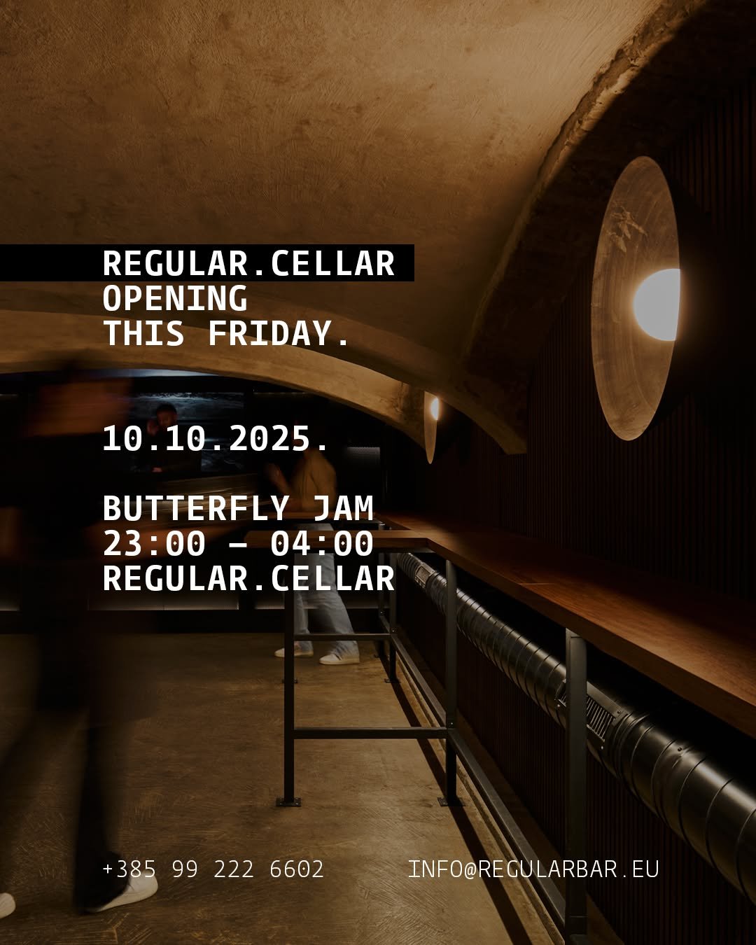 Regular marks one year of the city’s boldest burger with a night that’s as much about the music as it is about the food – and it also marks the long-awaited season opening of the Regular Cellar. On the terrace, Random Walsh brings more than 15 years of experience from different corners of the scene, with a reputation for moving dancefloors across the region. Downstairs, Butterfly Jam takes over – one of the freshest names in Zagreb’s scene, whose energy and creative approach, including throwing parties inside city trams, have already made him stand out.