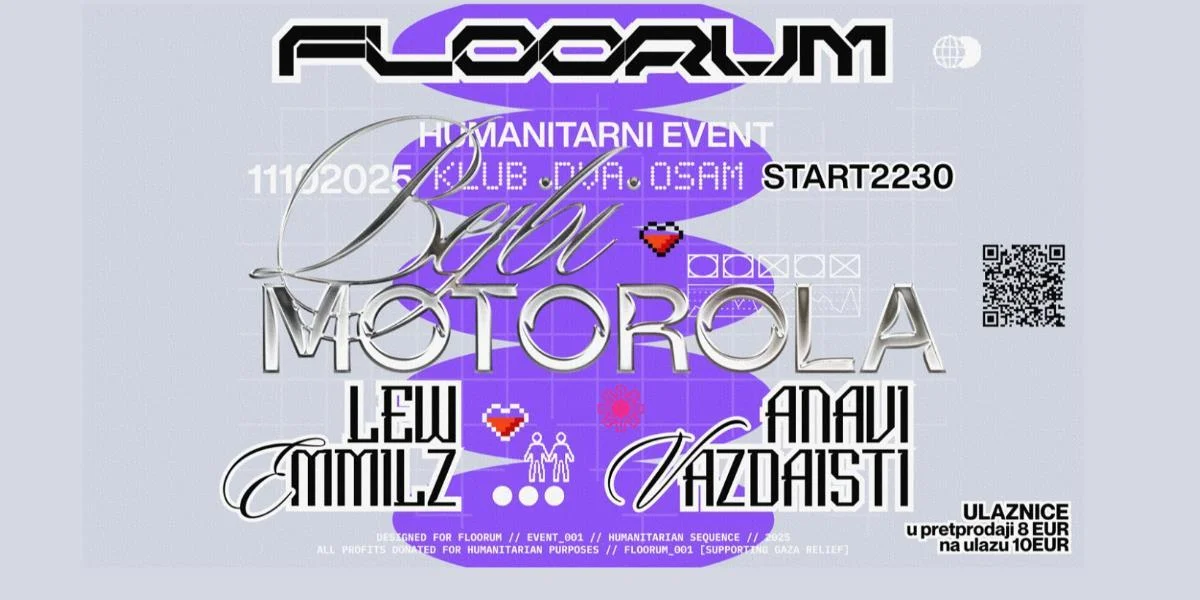 A new initiative by Forum mladih SDP-a Zagreb, FLOORUM connects club culture with social action – proving that nightlife can also give back. The first edition gathers Bejbi Motorola, Emmilz, Anavi, Lew, and Vazdaisti for a night that blends rap, techno, and bass music across six hours of energy and emotion. All ticket proceeds will be donated to Gaza relief efforts via the Launch Good Foundation, turning the dancefloor into a space of solidarity.